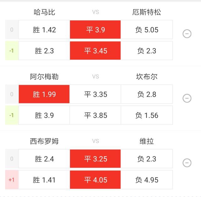 今天的比赛一共有四场,两场荷乙附加,一场瑞超,一场英冠附加。选了002瑞超哈马比VS奥斯特桑斯、003阿尔梅勒城VS坎布尔、004西布罗姆维奇VS阿斯顿维拉三场比赛组了一个三串四。