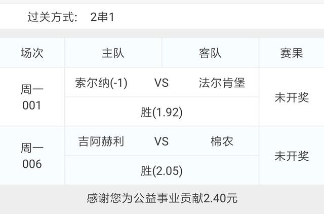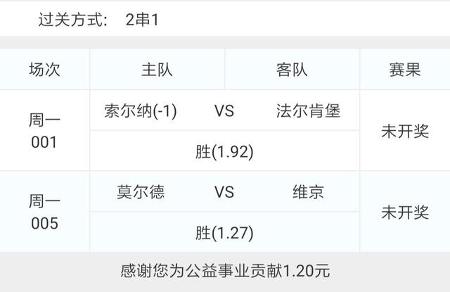 今天一共有六场比赛,组了一个低赔二串一和一个三串四博单。低赔二串一是001索尔纳VS法尔肯堡和005莫尔德VS维京!