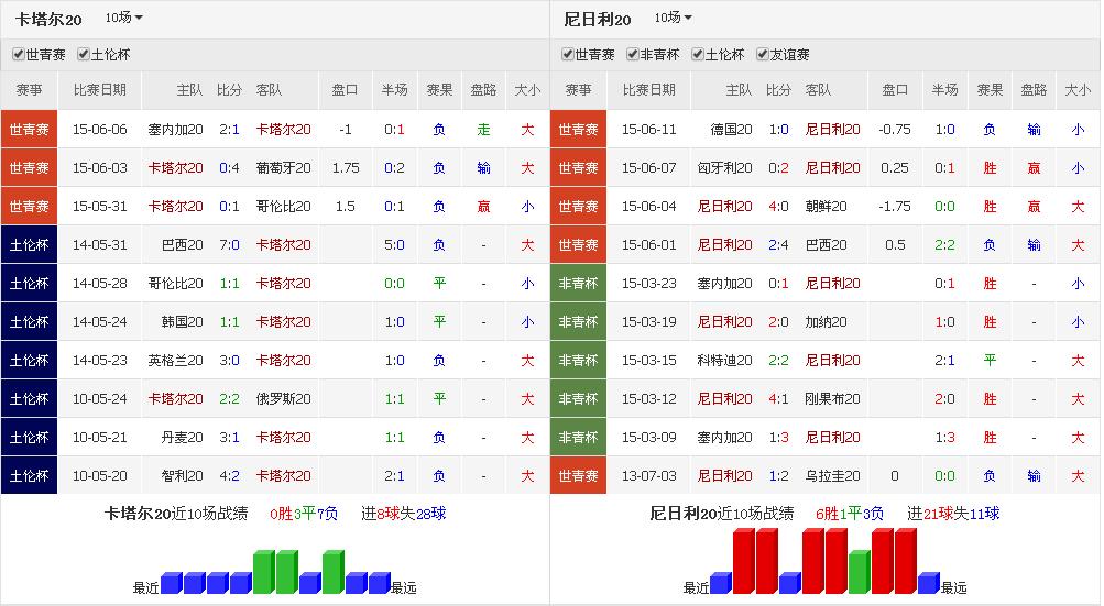本场客队尼日利亚U20在今年的U20非锦赛中杀入四强,遂获本届U20世锦赛参赛资格。小组赛2胜1平头名出线,淘汰赛首战点球不敌马里、季军战同样点球不敌南非。此前12次参加U20世锦赛,拿到2次亚军和1次季军。而卡塔尔U20之前只有4次亮相,拿到过1次亚军。尼日利亚U20在赛事底蕴上更优。最近一场正式比赛对南非U20没有进球,非青杯5场除首战2比0布隆迪U20外其余场均进球不超过1球,2场被对手零封,火力很差。