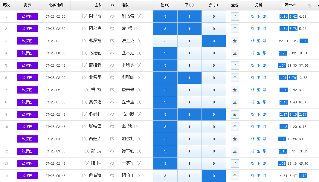 本期欧联杯可以说对阵实力差距较大,有十二场比赛存在较为明显的倾向性。胜赔在1.20以下的比赛我们就忽略不提了,毕竟狼队击败十字军、西班牙人击败加尔扎拜尔星、都灵击败德布雷塞尼、流浪者击败下科恩、法兰克福客场击败塔林弗罗拉都应该没有什么悬念。