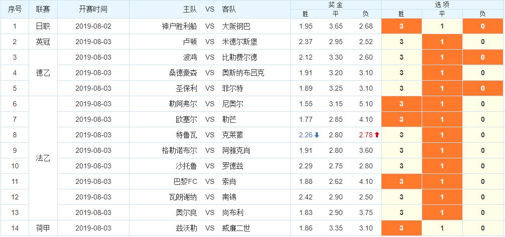 胜负彩14场第19096期将由日职、英冠、德乙、荷甲和法乙组成。英冠和荷甲新赛季揭幕战,法乙和德乙都进入第2轮,由于新赛季各支球队尚且在磨合期,表现和实力未充分暴露出来,因此对于比赛的把握难度不小。尤其是涉及法乙联赛,比赛更是难测,这期奖金预计不会低。