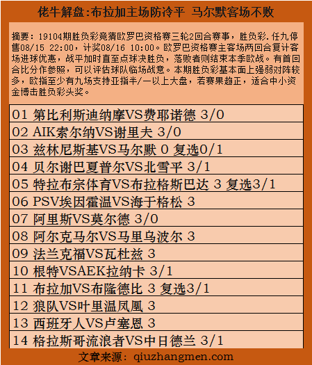 19104期胜负彩竞猜欧罗巴资格赛三轮2回合赛事,胜负彩.任九停售08/15 22:00,计奖08/16 10:00。欧罗巴资格赛主客场两回合复计客场进球优惠,战平加时直至点球决胜负,落败者则结束本季欧战。有首回合比分作参照,可以评估球队临场战意。本期胜负彩基本面上强弱对阵较多,欧指至少有九场支持亚指半/一以上大盘,若赛果趋正,适合中小资金博击胜负彩头奖。
