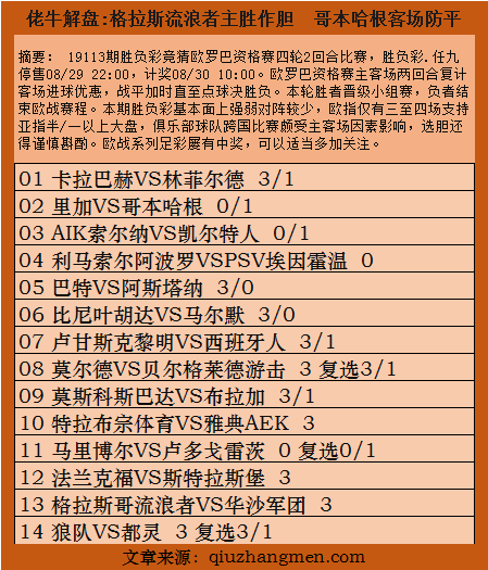 19113期胜负彩竞猜欧罗巴资格赛四轮2回合比赛,胜负彩.任九停售08/29 22:00,计奖08/30 10:00。欧罗巴资格赛主客场两回合复计客场进球优惠,战平加时直至点球决胜负。本轮胜者晋级小组赛,负者结束欧战赛程。本期胜负彩基本面上强弱对阵较少,欧指仅有三至四场支持亚指半/一以上大盘,俱乐部球队跨国比赛颇受主客场因素影响,选胆还得谨慎斟酌。欧战系列足彩屡有中奖,可以适当多加关注。