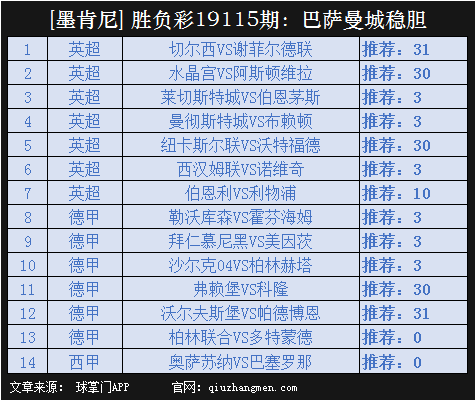 胜负彩19115期传统的英超+德甲组合,多支强队如巴萨、拜仁,曼城等出战,8月31日停售,敬请留意。