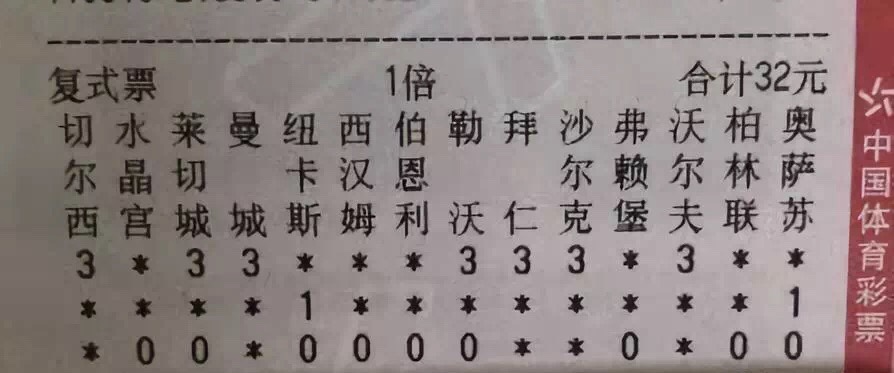 昨天也是自己尝试买了一个32元的14场玩了玩,德甲的两场勒沃库森和沃尔夫斯堡真是坑爹无极限,两场平局亦是很无语,而多特蒙德的输球和巴塞罗那的平局亦是意料之中的事,倒是切尔西的平局有点意料之外......