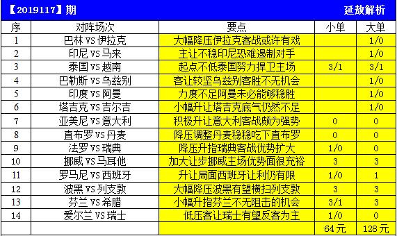 19117期是亚洲预选(6)+欧洲预选(8)的组合。从亚指机构数据来看,目前主队为让球方的比赛有6场,7场客队为让球方以及1场平手的场次;其中,亚指让幅超过(或等于)半球比赛有10场之多,超过(或等于)1球的比赛有6场,整体对阵比较悬殊。