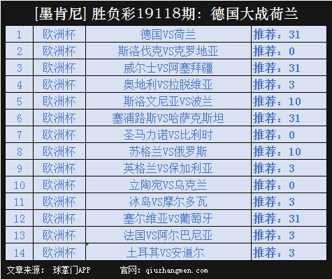 胜负彩19118期竞猜14场欧洲杯预选赛赛事,本期9月6日停售,敬请留意。