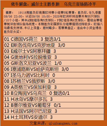19118期胜负彩竞猜欧预赛小组赛5轮赛事,胜负彩.任九停售09/06 22:00,计奖09/08 10:00。2020年欧洲杯预选赛共有55只球队/10个小组,其中A到E组各有5支球队,F到J组各有6支球队,需结合赛程赛制评估球队临场战意。本期胜负彩国家队分组赛强弱对阵较多,欧指八场最低支持球.半以上深盘,胆材略多,若赛果趋正,适合中小资金博击胜负彩头奖。