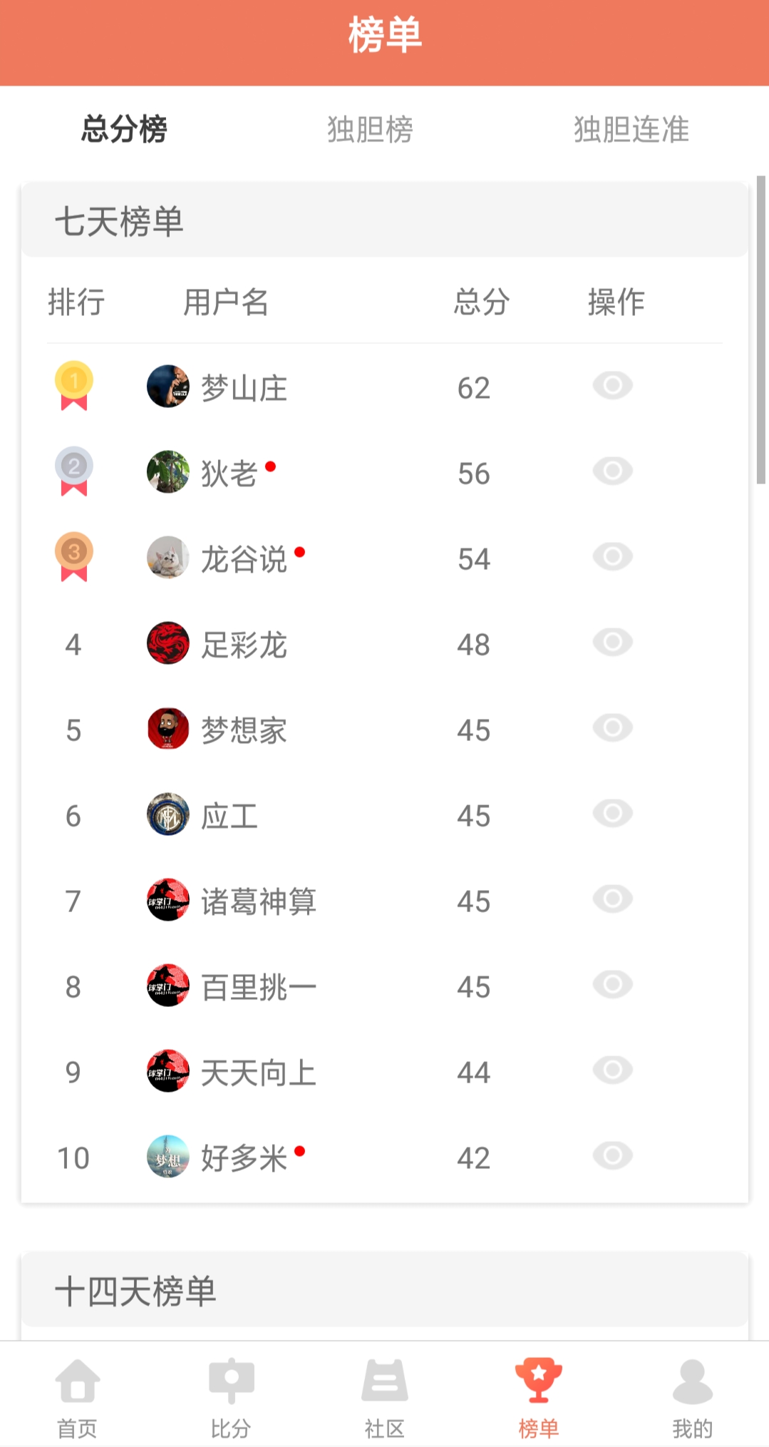 总体成绩依然稳定的是:梦山庄(第19039期掌门人)、老狄(3中2)、龙谷说(昨天标题提名3场全中,)、百里挑一(第19030期掌门人) 积分都达到了50分以上。