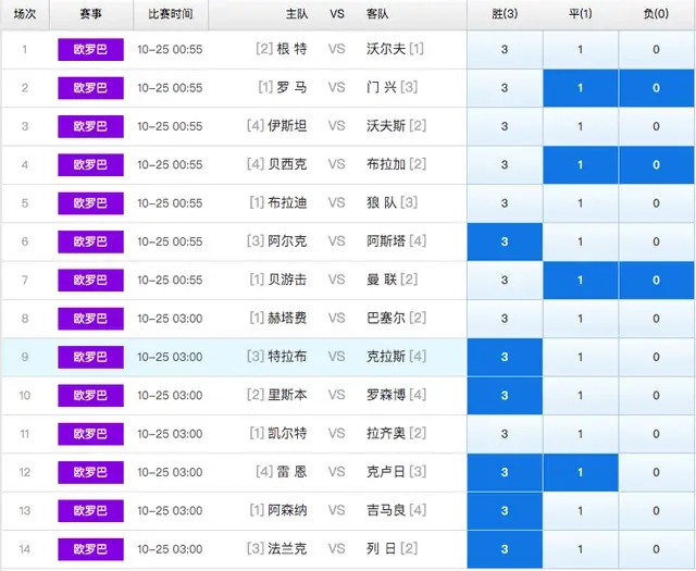 14.法兰克福上周五联赛中3:0大胜勒沃库森,最近五场比赛三胜两平保持不败,新的锋线组合火力全开。标准列日最近四场比赛只赢下一场,状态平平,客场战绩更是一言难尽。初盘主让一球球半,单3过。