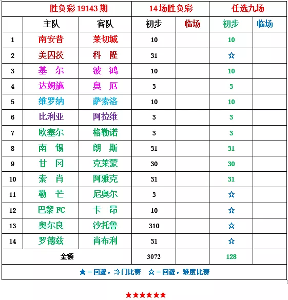 昨日欧联专场的胜负彩中,赫塔菲与雷恩爆出大冷,全国一等奖开出38注,奖金高达28万元之多,九场奖金则是开出1512元,本期胜负彩依旧是法乙独挑大梁,配合其他5个联赛,难度相对较大,过多的浅开场次,显得有些无所适从,既定方案如下图所示