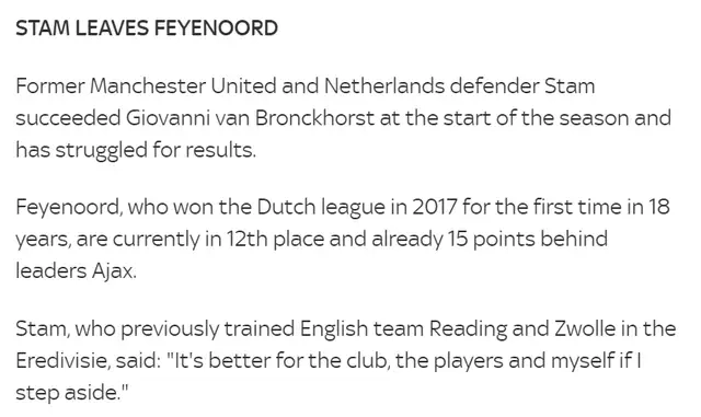 本赛季,费耶诺德成绩令人失望,上周末他们刚刚0-4惨败死敌阿贾克斯,结果第二天斯塔姆就宣布辞职。