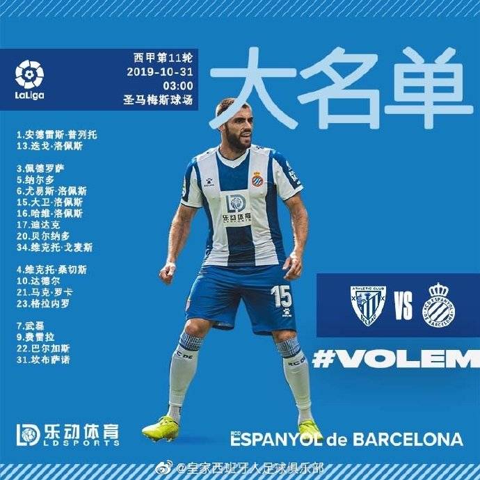首页/ 赛事正文球掌门10月29日讯 西班牙人公布了下轮西甲的球队大名单,武磊在列。西班牙人将在北京时间10月31日凌晨3点客场对阵毕尔巴鄂竞技。