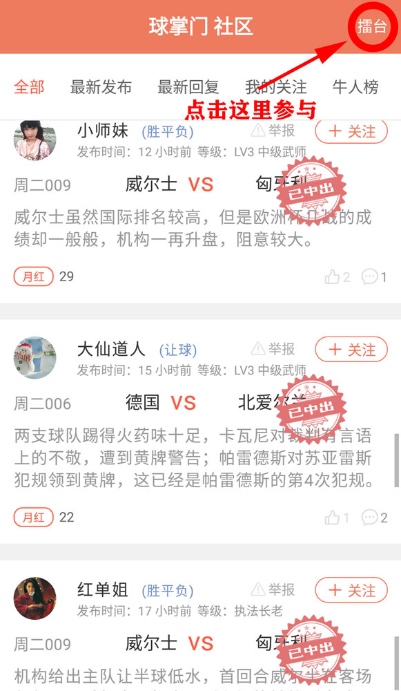 球掌门是高手的象征,是来自全国各地,五湖四海的足球高手聚集地,社区内公开交流,专门为大家打造了发现高手,统计高手,跟踪高手的方式,让大家在愉悦的竞猜