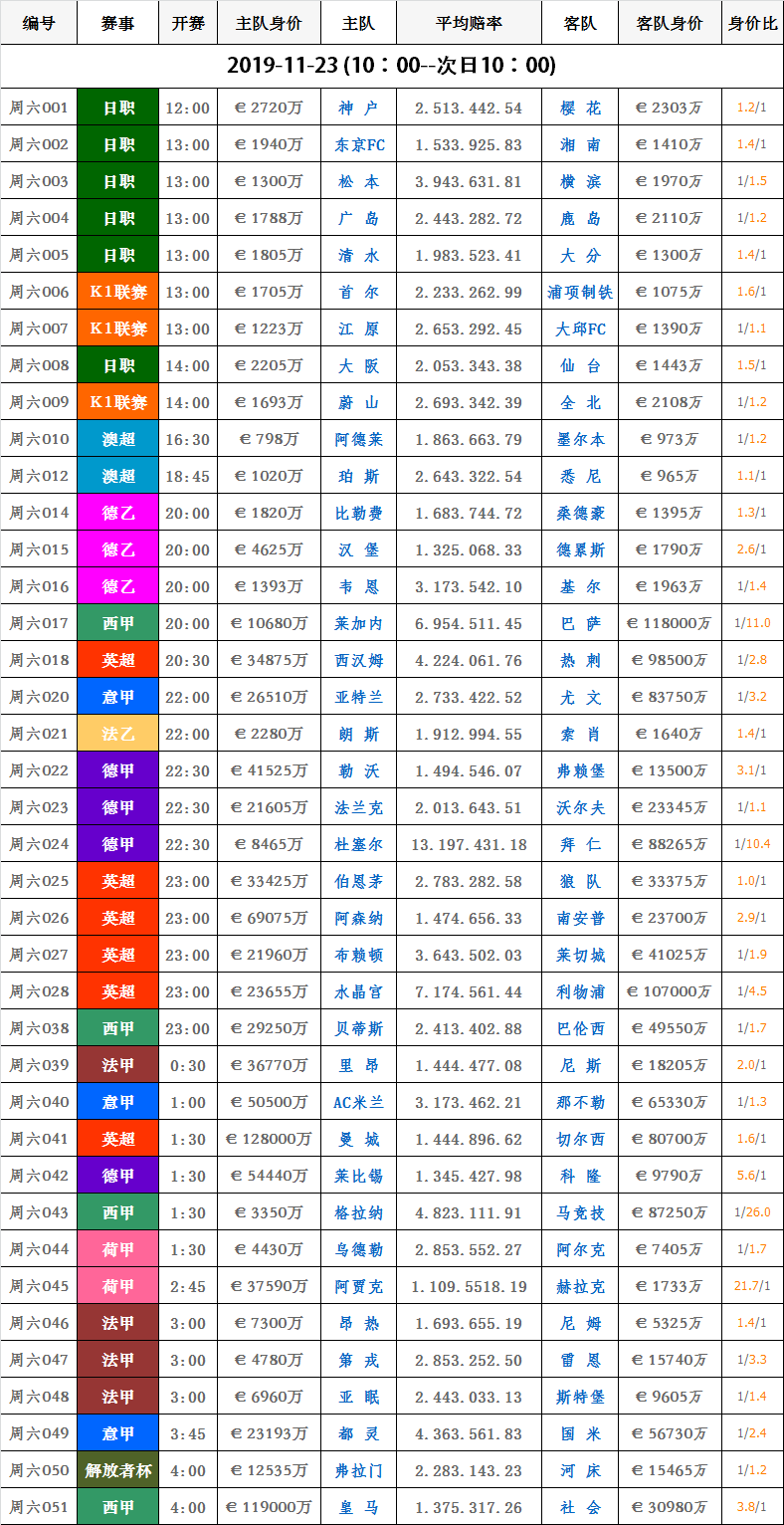 11月23日赛事|热门球队身价对比表