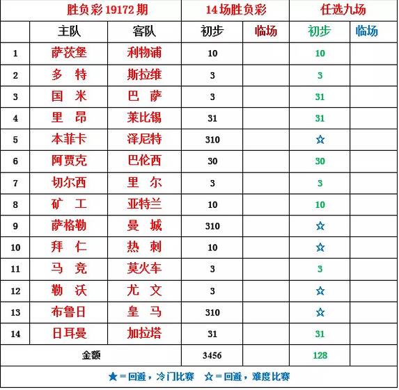 周末的胜负彩果真如预期所想,过多的浅开场次,直接造就900多万的滚存,二等奖开出9万多元,九场奖金则是给出34071元;本期胜负彩是欧冠专场,作为小组赛最后一轮的较量,形势明朗,是非曲直也将见分晓,选定方案如下。