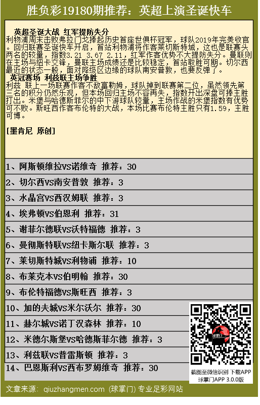 利物浦周末击败弗拉门戈捧起历史首座世俱杯冠军,球队2019年完美收官。回归联赛圣诞快车开启,首站利物浦将作客莱切斯特城,这也是联赛头两名的较量,指数3.21 3.67 2.11,红军作客优势不大提防失分。曼联则在主场与纽卡交锋,曼联主场成绩还是比较稳定,首站取胜可期。切尔西最近的状态一般,面对降级区边缘的球队南安普敦,也要反弹了。