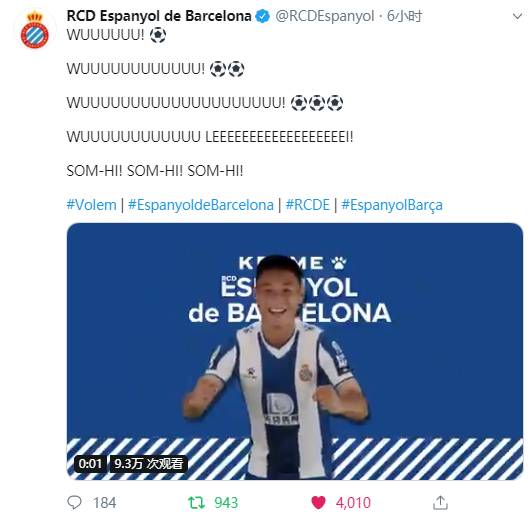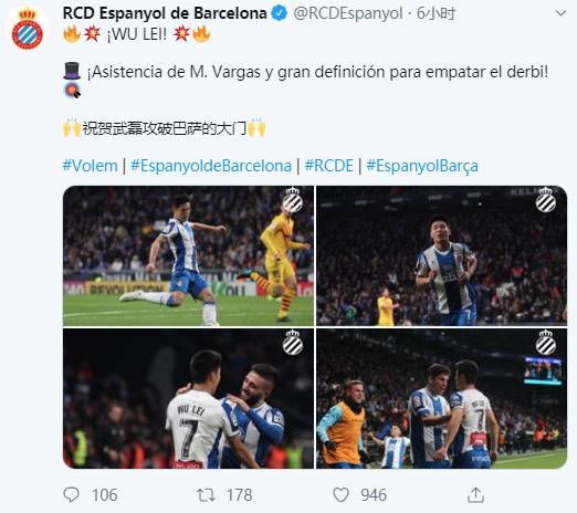 武磊第73分钟替补登场,第88分钟攻入绝平单刀球。在武磊完成冷静一击之后,西班牙人官推也陷入狂喜中,连续打出“破音式”的一连串“WU LEI”字符,庆祝这个宝贵的绝平进球。