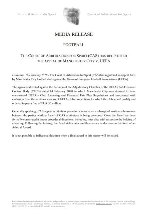 首页/ 赛事正文球掌门2月26日获悉 国际体育仲裁法庭(CAS)官方宣布,针对此前欧足联下发的两个赛季欧战禁赛以及罚款的处罚决定,曼城俱乐部已经正式提交上诉文件。