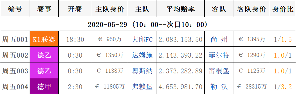 5月29日赛事|周五球队对阵身价数据表
