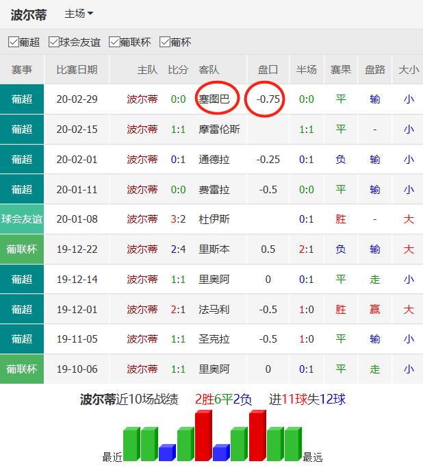 波尔蒂在疫情前打塞图巴尔让0.75球上盘满水,塞图巴实力基本与本场的客队维森特差不多,所以以波尔蒂让球的能力,本场主让半球是说的过去。