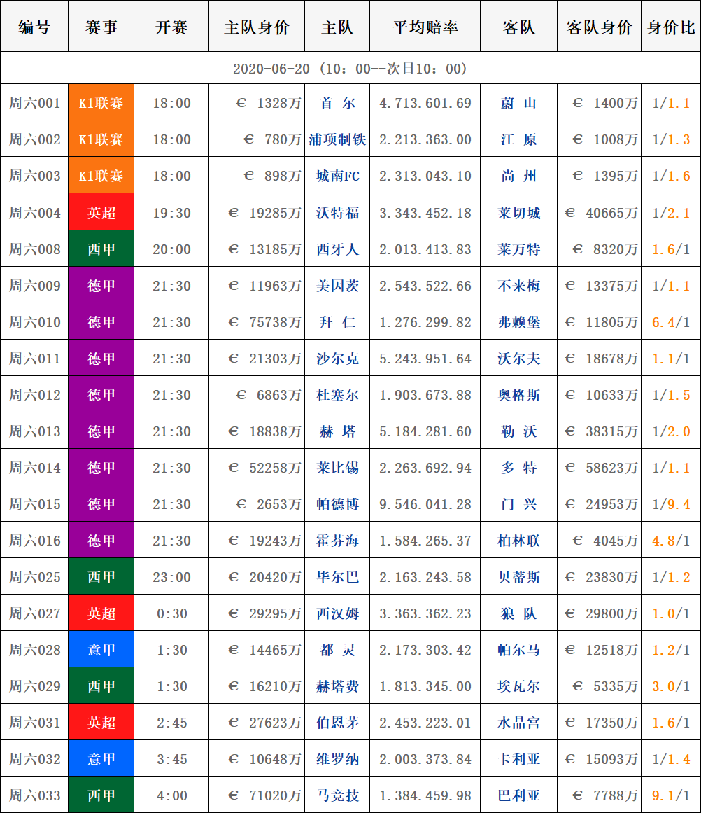 6月20日赛事|周六球队对阵身价表