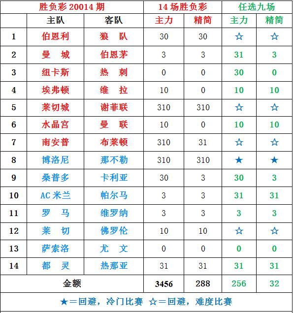 今天我的思路还是以赛季末的战意为主导因素结合数据进行分析判断,同时依旧着重深让场次平局的防范,尽量做到合理性和博冷性兼具,同时参考了大家的建议将胜负彩和任九分别做了主力和精简两套方案,主力方案为当期的全部心水场次,精简方案则在此基础上对部分场次进行博选以求降低本金。这主要考虑到个人玩家的本金压力,当然了本金少也意味着中奖难度的增加,请大家按照自身需求分别进行参考。