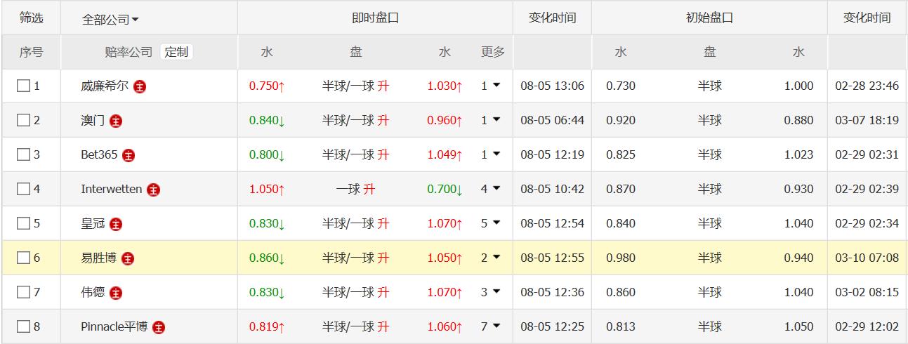 本场比赛多数机构初盘开出国米让半球中水,部分给出半一高水,后市上盘水位持续走低,以两队最近的状态和实力,机构也是进一步增大对国米的支持力度,因此本场比赛看好国米取胜!