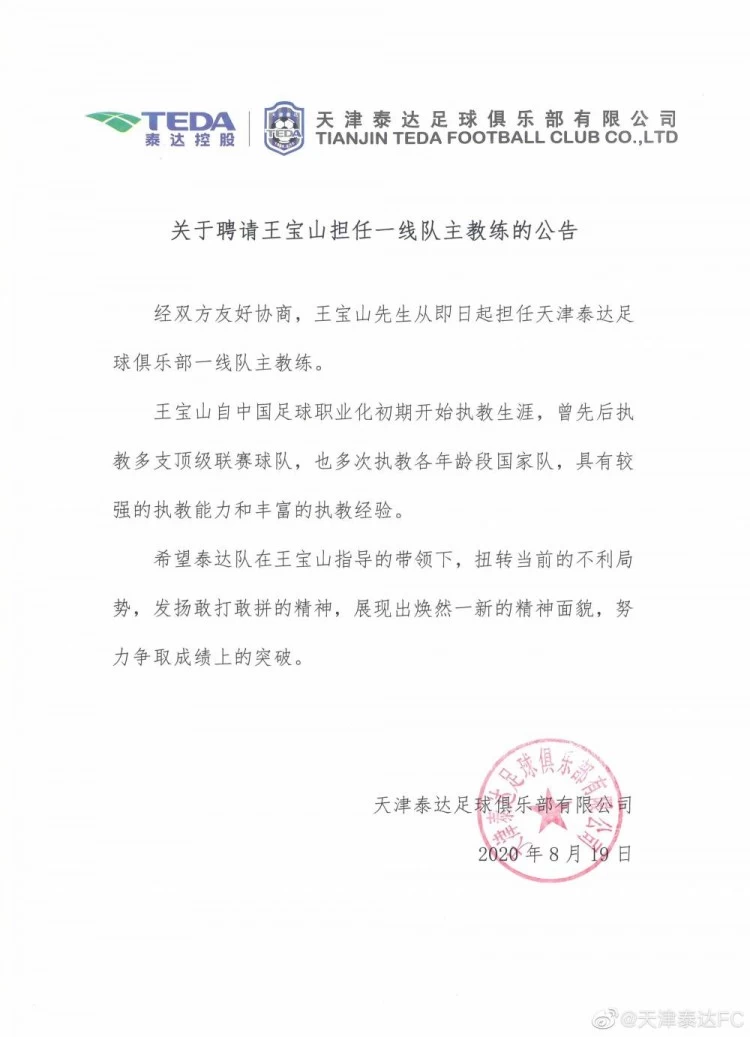 经双方友好协商,王宝山先生从即日起担任天津泰达足球俱乐部一线队主教练。