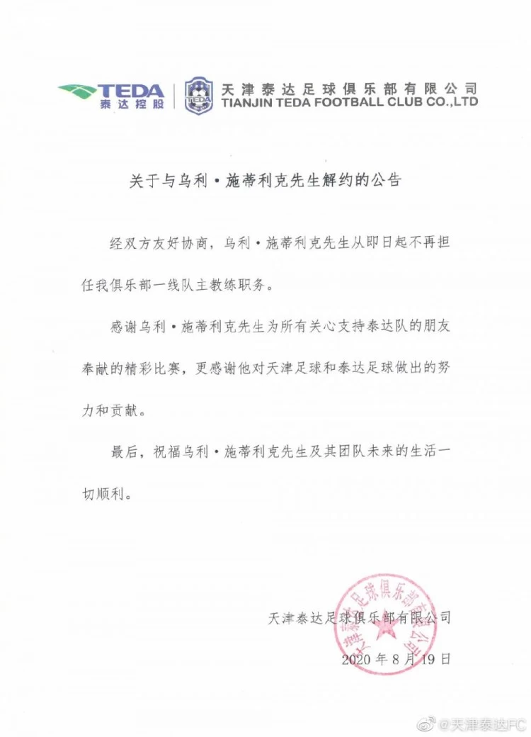 经双方友好协商,乌利-施蒂利克先生从即日起不再担任我俱乐部一线队主教练职务。