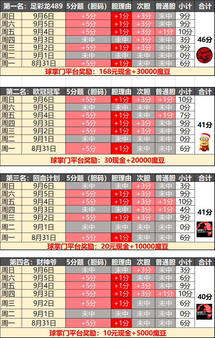 第2020036期 周榜1名 足彩龙489(积分46分)