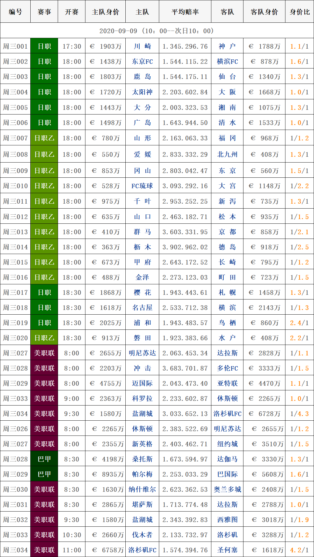 9月9日赛事|足球球队对阵身价数据表