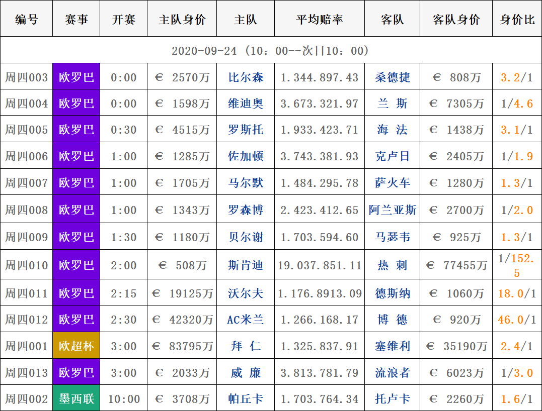 足球赛事|周四球队身价数据表