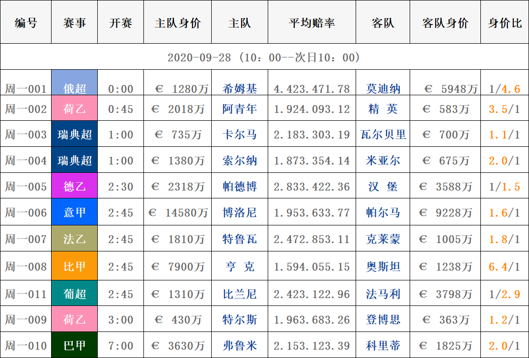 9月28日赛事|周一球队对阵身价数据表
