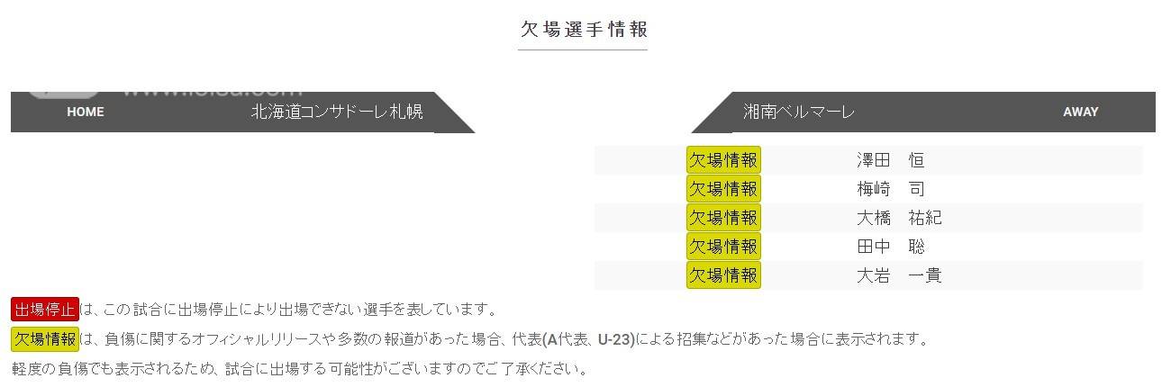 本场比赛,湘南海洋共有5名球员缺阵,除了三名老伤号泽田恒、梅崎司和大桥祐纪之外,后防主力大岩一贵也加入到了伤病名单之中,恢复时间待定。