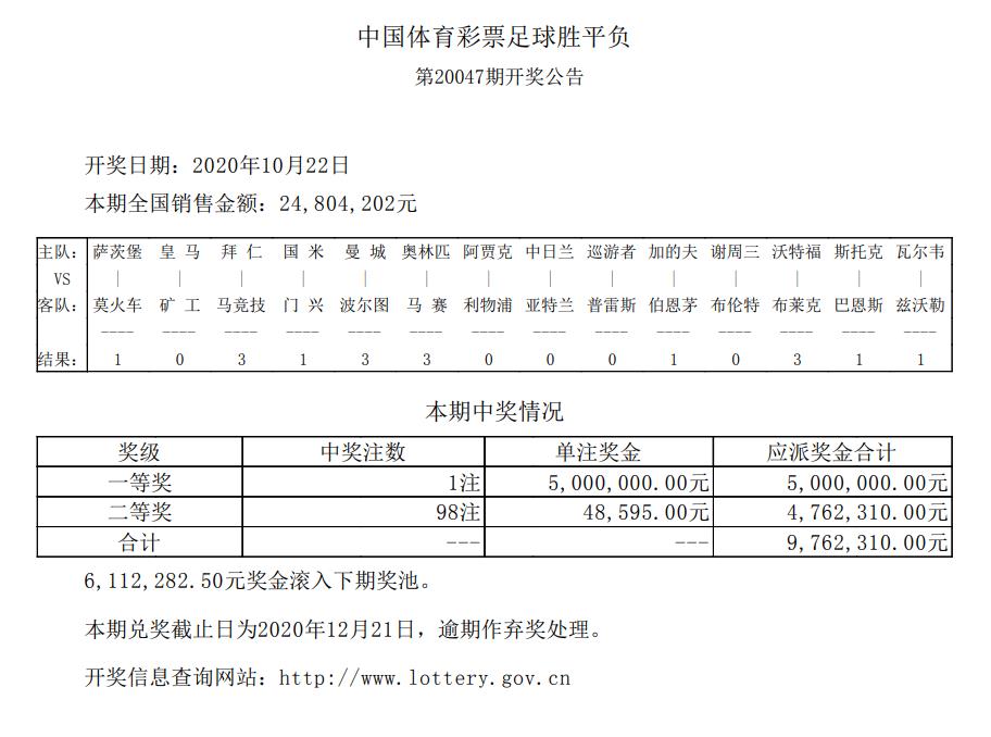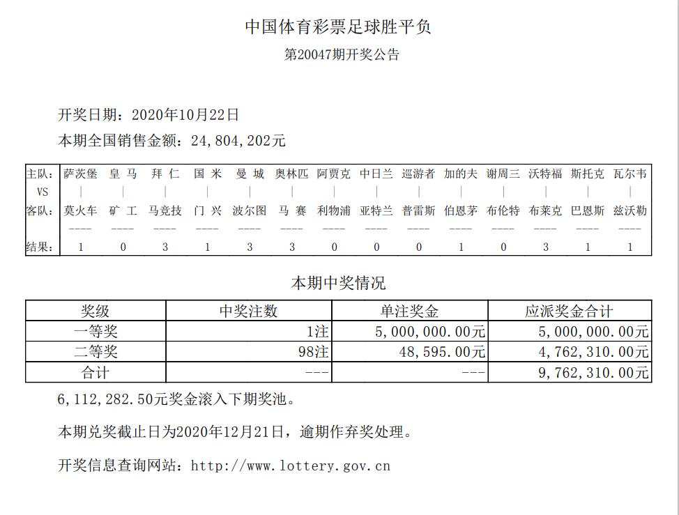 首页/ 赛事正文北京时间10月22日,胜负彩第20047期开奖结果揭晓。本期一等奖开出1注,单注奖金500万元,二等奖开出98注48595元,611万元滚入下期奖池;任九开639注21111元。本期足彩14场投注总额为24,804,202元,任九投注总额为21,078,574元。