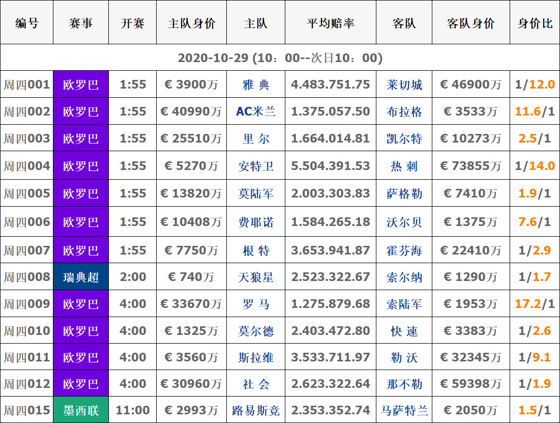 27日足球赛事|周四球队对阵身价数据信息汇总