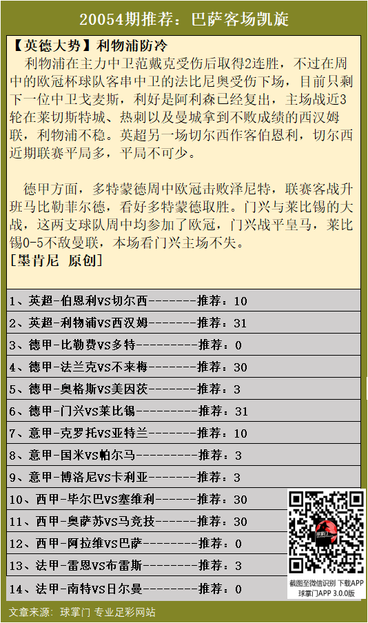 首页/ 赛事正文利物浦在主力中卫范戴克受伤后取得2连胜,不过在周中的欧冠杯球队客串中卫的法比尼奥受伤下场,目前只剩下一位中卫戈麦斯,利好是阿利森已经复出,足球14场推荐2020054期五大联赛赛事,10月31日(周六)21点00分截止,敬请留意