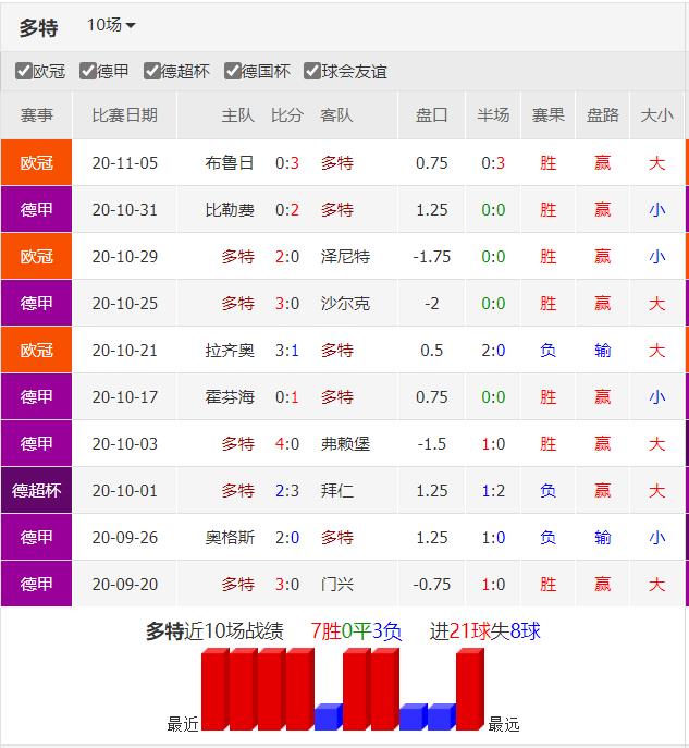 德甲豪门多特蒙德上赛季排名第2位。新赛季6轮战罢拿到15分暂列第2,与拜仁同分但净胜球少4球。首席射手哈兰德上赛季中途加盟后15场德甲13球3助。新赛季各项赛事10战10球3助攻,效率惊人。新赛季主场打进10球丢0球,而客场打进3球丢2球。上赛季多特蒙德主场比客场多进8球,少丢7球。主场攻守表现一直好于客场。周中欧冠客场3比0击败布鲁日,最近各项赛事砍下4连胜的优异战绩。最近6场比赛只有1场能在上半时进球,而拜仁慕尼黑新赛季12场比赛均能在上半场进球。