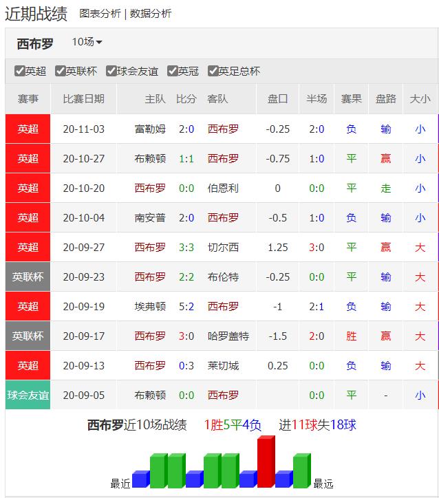 升班马西布朗7轮英超联赛过后3平4负积3分排名联赛倒数第三,目前被富勒姆反超后离安全区1分。在夏窗压哨签下的哈镇前锋格兰特,上赛季英冠出场44场打进19送出4助攻排名英冠射手榜第四位。近3次英超主场交手热刺均保持不败,并且上一场18年5月的交手凭借利弗莫尔的进球在主场1-0击败了热刺。上轮联赛客场0-2不敌同为升班马的农场主富勒姆,依然没有拿到自己的英超赛季首胜。目前7轮比赛打进6球的西布朗仅仅领先于7轮比赛过后打进3球的谢菲联以及伯恩利,球队的进攻效率问题还需改进。在7轮联赛过后西布朗已经丢掉了16球,是目前英超联赛当中丢球最多的球队,未经补强的后防目前阶段依然不堪一击。