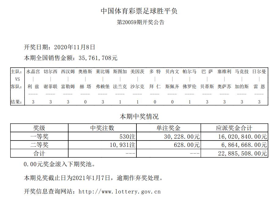 北京时间11月8日凌晨,胜负彩第20059期结束了全部14场比赛的争夺。本期销量为35,761,708元,任九投注总额为27,586,128元,德甲焦点战,多特主场2-3不敌拜仁;西甲赛场,巴萨5-2完胜贝蒂斯、马竞4-0大胜加的斯、塞维利亚1-0小胜奥萨苏纳。
