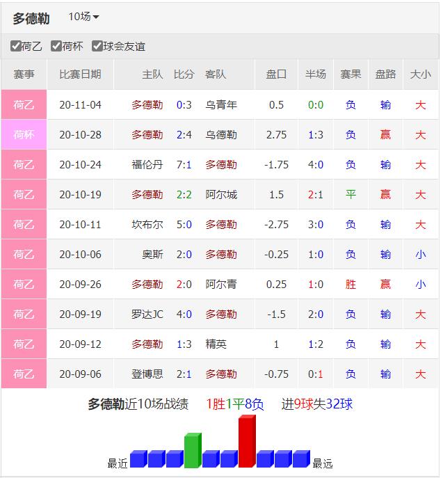 鱼腩多德勒支本赛季10轮战罢积5分排名垫底,第一阶段也排名垫底。两队近6次交锋多德勒支3胜3负,不败率50%。上轮主场0-3不敌乌德勒支,让对手23脚射门射正11次,防守松散。近6场比赛1平5负,表现极为低迷。