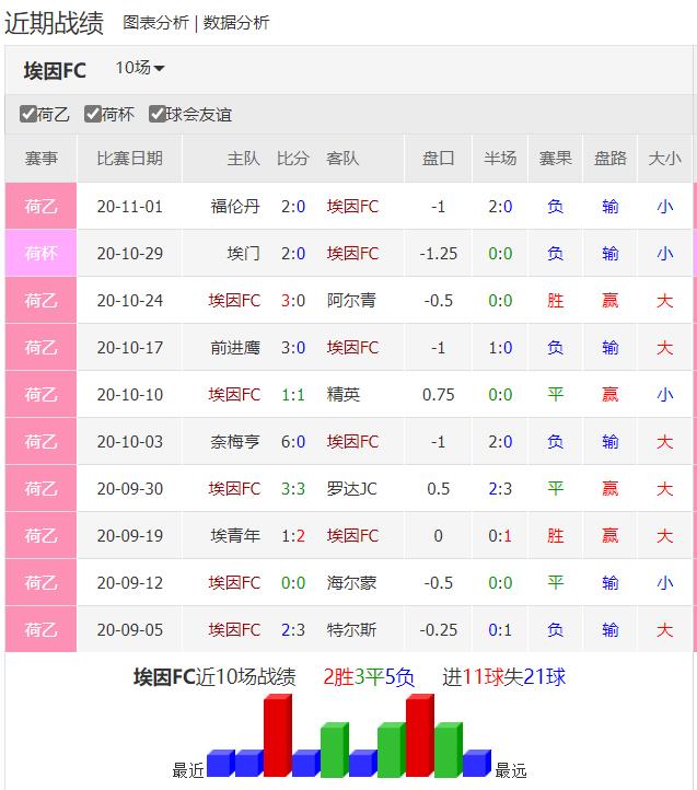 中下游球队埃因霍温FC本赛季10轮战罢积12分排名第13,第一阶段排名第12。本赛季5个客场全部输球,客场战绩排名垫底。本赛季场均进0.7球失2.8球,是联赛进攻最差,防守第2差的球队。上轮客场0-2不敌福伦丹,实力差距较大。近6场比赛1胜1平4负,有4场被零封,进攻时常哑火。