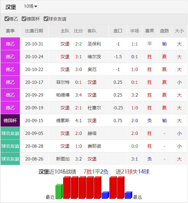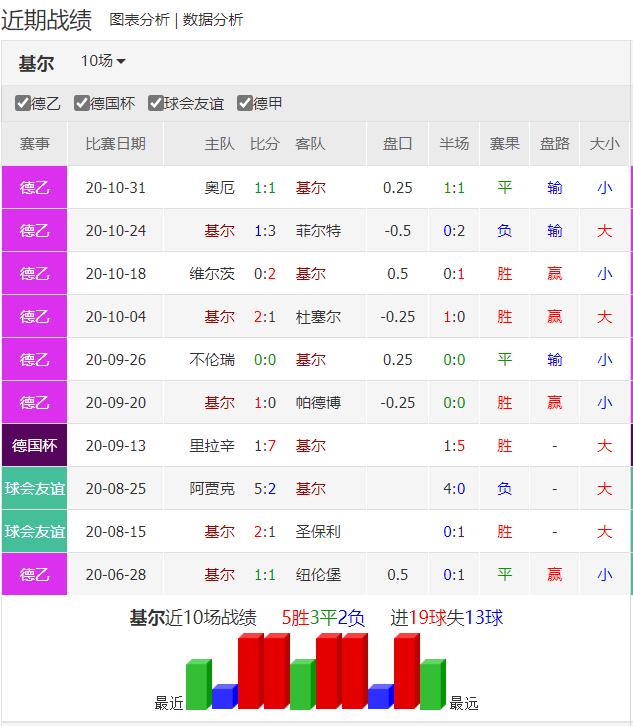 1.德乙劲旅汉堡连续两赛季排名德乙第4,新赛季目前6轮积16分暂列德乙第1。汉堡18/19赛季降至德乙后尚未赢过基尔,总战绩2平2负,上赛季主客皆平基尔,客场1比1带走1分。首席射手特罗德目前已砍下8个联赛进球,领跑德乙射手榜。上赛季17个主场10胜4平3负,去到客场则4胜8平5负,是一支主客场表现有明显差异的球队。上轮联赛主场打进圣保利2球,最近3场联赛每场都打进不止1球,进攻状态勇猛。之前连续零封菲尔特和奥厄,但最近2场联赛连续丢球,而且都在上半场出现丢球,防守退步。