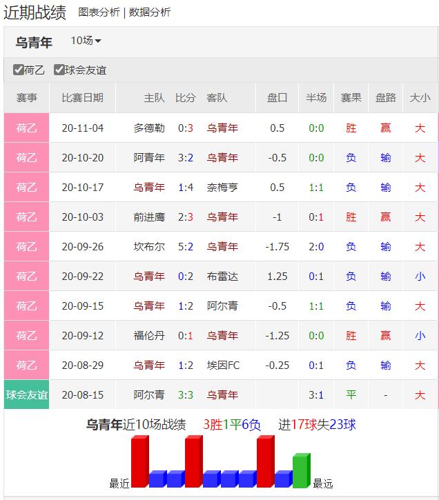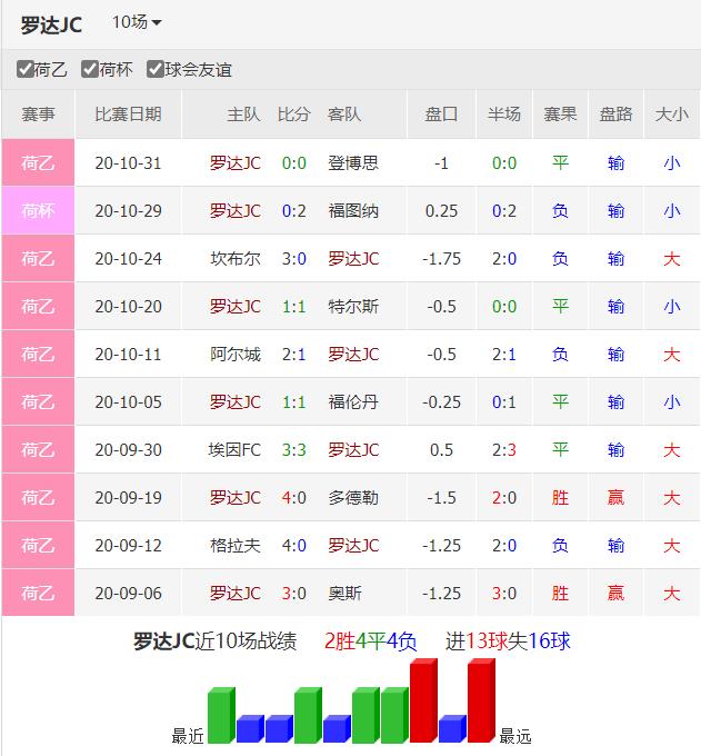1.弱旅乌德勒支青年队本赛季9轮战罢积9分少赛1轮排名第14。4次对阵罗达JC,战绩为2胜2负,不败率50%。本赛季客场战绩排名第7,而主场战绩排名垫底,客强主弱。上轮客场3-0战胜多德勒支,全程压制对手,下半场连入3球。近6场比赛2胜4负,攻防大开大合不败率低下。