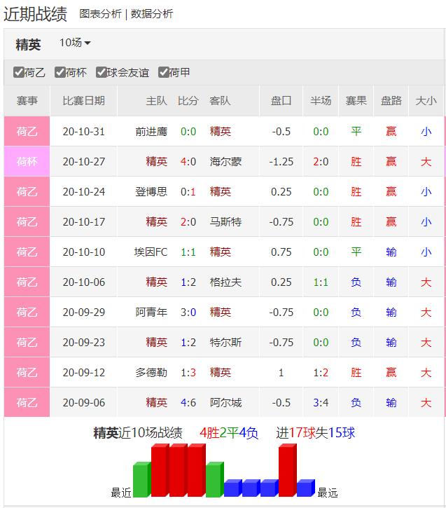 SBV精英本赛季10轮战罢取得4胜2平4负暂时排名荷乙第9。上赛季SBV精英先进球的比赛14场比赛中取得10胜3平,球队打顺风球的能力很强。联赛至今只打进8球,是荷乙进攻火力最差的球队。本赛季主场1胜3负,主场成绩排名联赛倒数第4,球队主场成绩不甚理想。上个主场在荷兰杯比赛中4比0横扫海尔蒙,球队迎来主场两连胜,一扫此前三连败的颓势。本赛季联赛4个主场只有1场零封,其余3场被对手打进10球,主场防守较差。