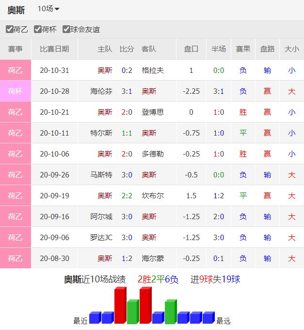 荷乙中下游球队奥斯本赛季9场过后积8分,排名荷乙联赛倒数第4。上轮联赛客场1-1逼平特尔斯达,球队取得联赛第一个客场积分,状态回升,信心大增。上场比赛主场0比2不敌格拉芙夏普,近期比赛两连败,状态不佳。