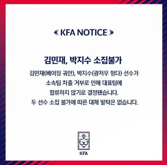 球掌门11月10日获悉:韩国足协官方消息,金玟哉和朴志洙决定不参加本期国家队集训。