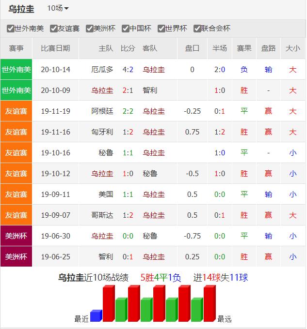 南美传统强队乌拉圭目前世界排名第7,美洲排名第2。最近3届世界杯他们全部打进决赛圈,先后取得第4名,16强和8强的好成绩。目前南美世预赛1胜1负排名第6。坐拥苏亚雷斯和卡瓦尼两大神锋,两人分别以61球和48球位列队史射手榜的第1和第2,他们的每个进球都是在创造乌拉圭足球的历史。上届世预赛乌拉圭两回合对阵哥伦比亚1胜1平保持不败,往绩交锋上占据优势。上轮世预赛在厄瓜多尔的高原主场吃尽苦头,最终2比4败下阵来,这是他们1年零7个月以来首次输球。