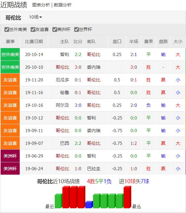 南美强队哥伦比亚目前世界排名第10位,美洲排名第4。近几年大赛发挥出色,2014年世界杯历史性打进8强,2038年世界杯打进16强。目前南美世预赛1胜1平暂时排名第3。哥伦比亚拥有J罗、夸德拉多、米纳、萨帕塔等在五大联赛中上游球队打主力的球员,实力在南美球队中也颇具竞争力。2019年以来哥伦比亚在主场进行的比赛一球未失,球队主场作战防守非常出色。上轮世预赛客场2比2绝平美洲杯双冠王智利,近期4场比赛取得3胜1平,竞技状态出色。
